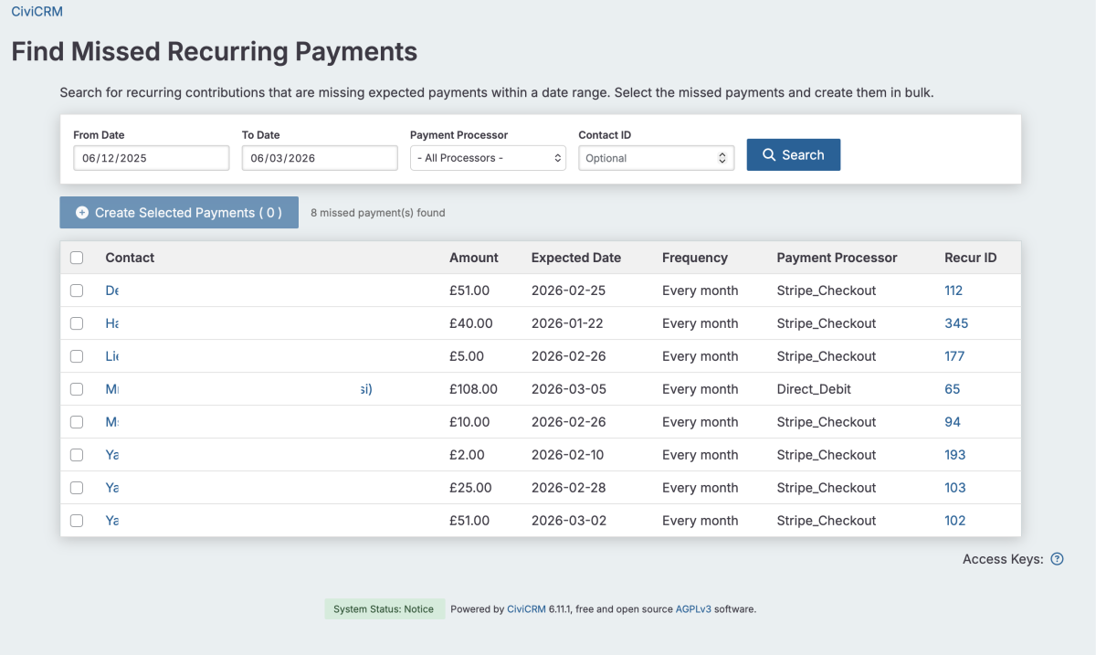 2. Create the missing contributions in bulk, backdated to the expected payment date